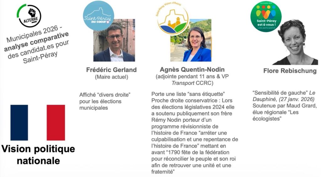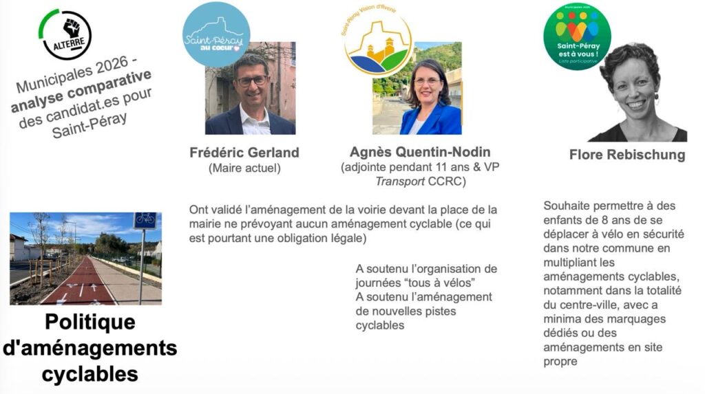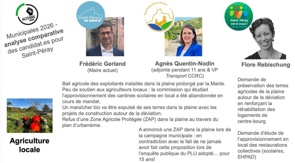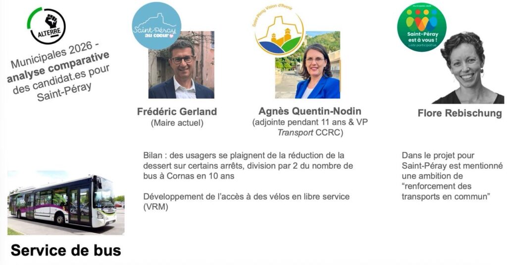 Afin d’éclairer les choix des électeurs pour les prochaines élections municipales de la Mairie de Saint-Péray et de la Communauté de communes Rhône Crussol, l’association ALTERRE vous propose une série d’analyse comparative des propositions et positionnements des trois listes concurrentes :